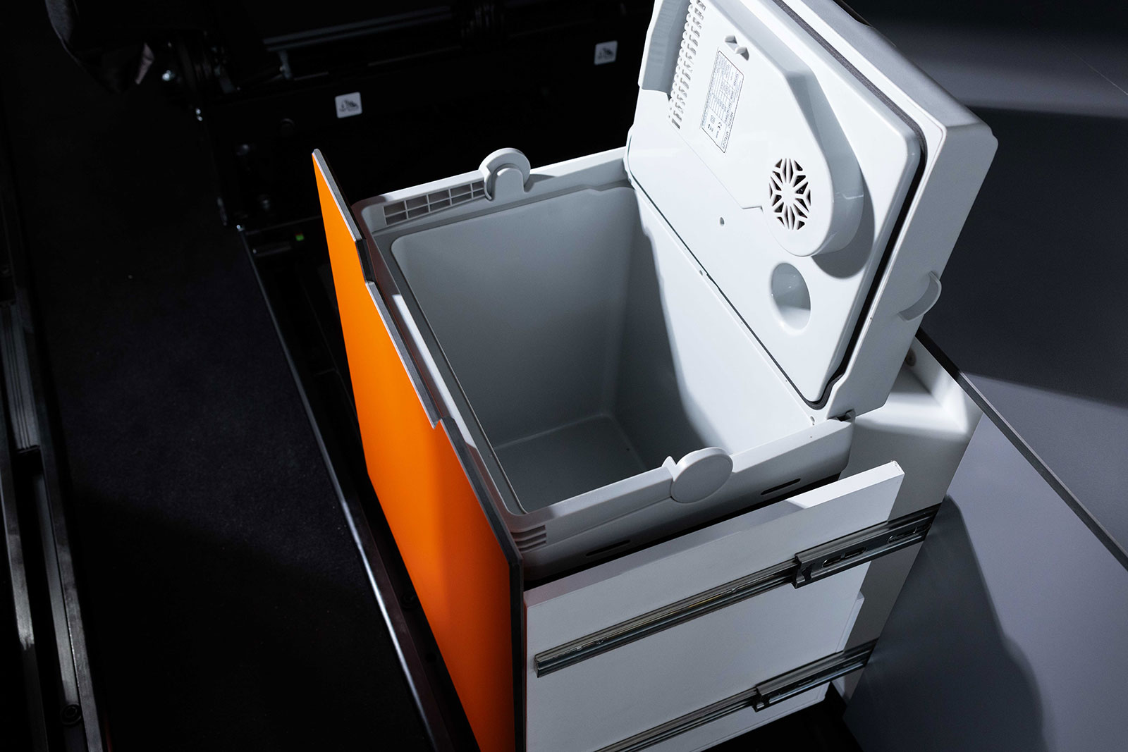 | Rear side cabinet, non-removable, includes: – Fixed induction cooker – Pull-out folding sink – Removable thermoelectric cooler (24l) – Water tank (10l) with submersible pump – Outside shower – Storage space – Mattress and support for lower bed |